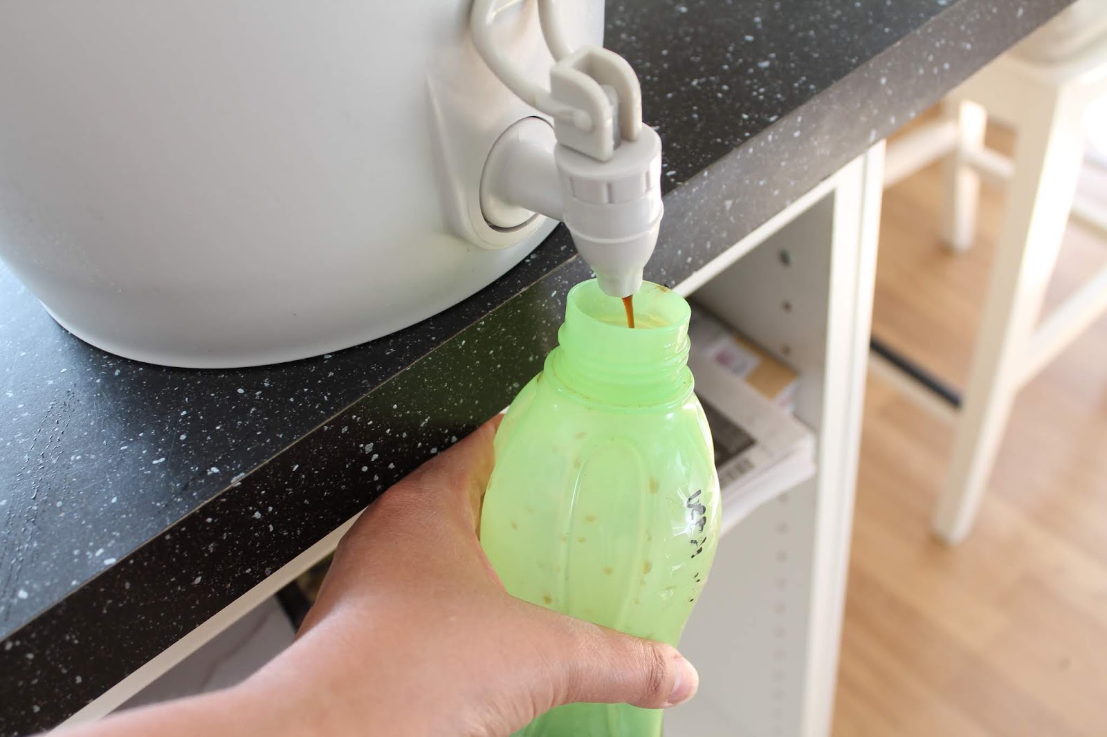 Töm hinken på Bokashilake cirka varannan dag. Förvara laken i en glasburk eller en flaska som du inte är rädd om. Tänk på Bokashilaken som en färskvara som trivs bäst i kylskåp, men jag vet folk som sparar Bokashilake i petflaskor i klädkammaren eller garaget hela vintern och som säger att det fungerar lika bra, jag har dock inte testat. Du kan även hälla Bokashilake i avloppet (perfekt att göra på vintern när inte den går åt i trädgården) eftersom de effektiva mikroorganismer som finns i laken äter upp fettet i avloppssystemet och på så sätt rengör dina avlopp. (Man kan även städa med EM men det blir ett annat inlägg).
