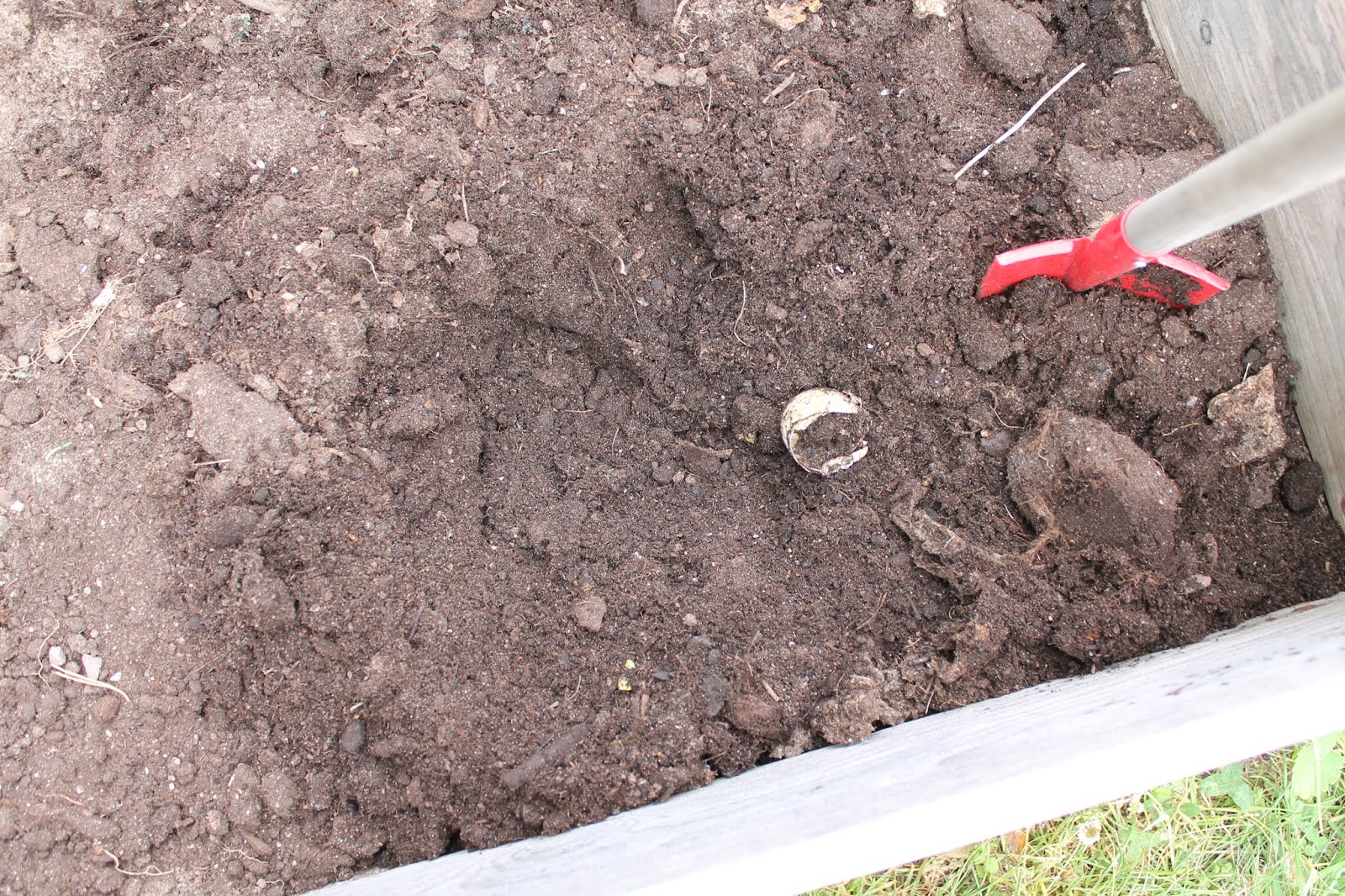 ag gräver ner min Bokashi i trädgården efter ett förutbestämt placeringsschema, på platser där jag vet att jorden behöver förbättras. Just nu har jag även en jordfabrik. En dubbelhög pallkrage där jag för närvarande inte odlar något utan som bara används till att gräva ner Bokashi i. Jag gräver helt sonika ut ett hål, stort som en hink och häller ner min Bokashi däri. Sedan hackar jag isär Bokashiklumpen lite innan jag öser över jorden jag grävt upp ur hålet och plattar till det lite. Ju mer jord ju bättre.